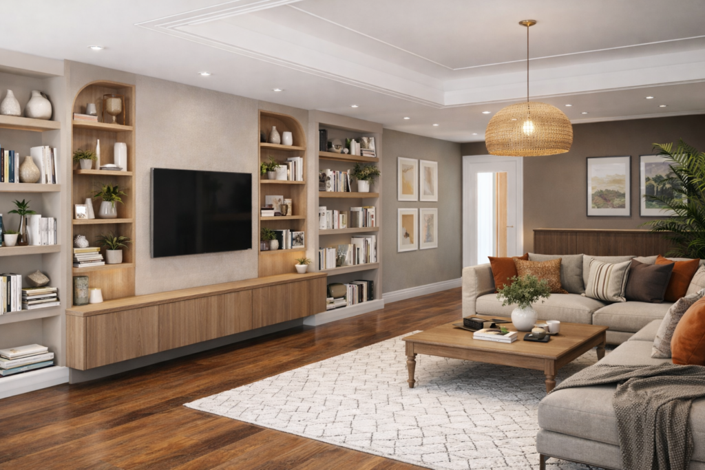Fonksiyonel çözümler, özel depolama alanları ve doğru aydınlatma seçimleriyle mekân hem estetik hem de kullanışlı hale getirildi.