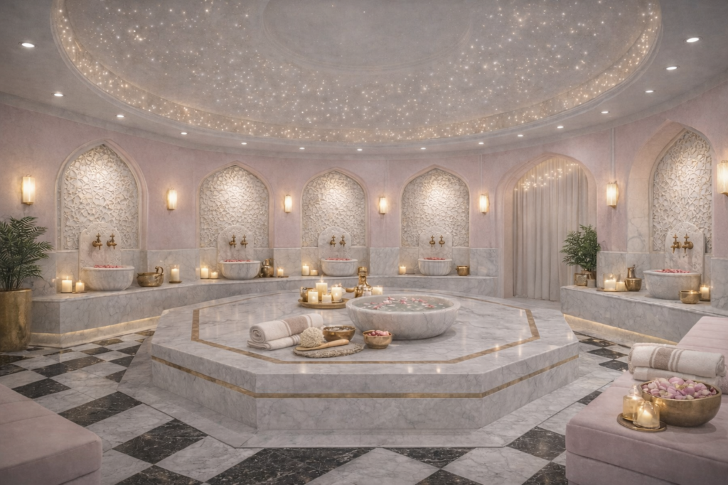 Hamam, dinlenme alanları ve bakım hacimleri arasında akıcı bir geçiş sağlanarak, deneyim odaklı bir kurgu hedeflendi.