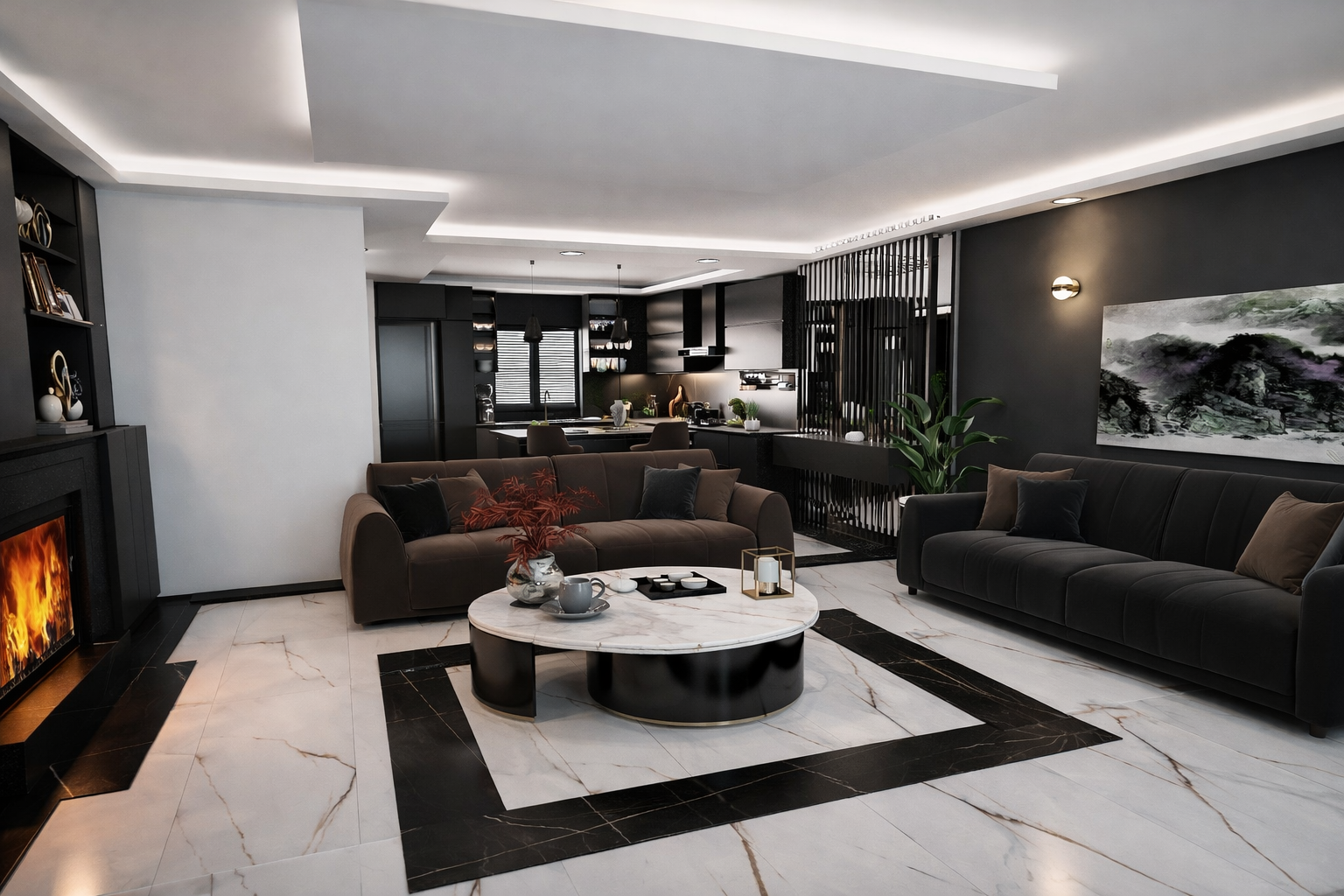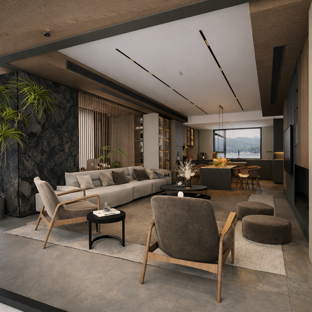 Açık plan yaşam alanı, koyu tonlar ve doğal ahşap dokularla dengelenerek güçlü bir karakter kazandırıldı.